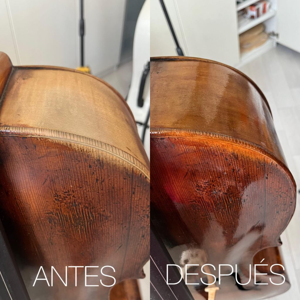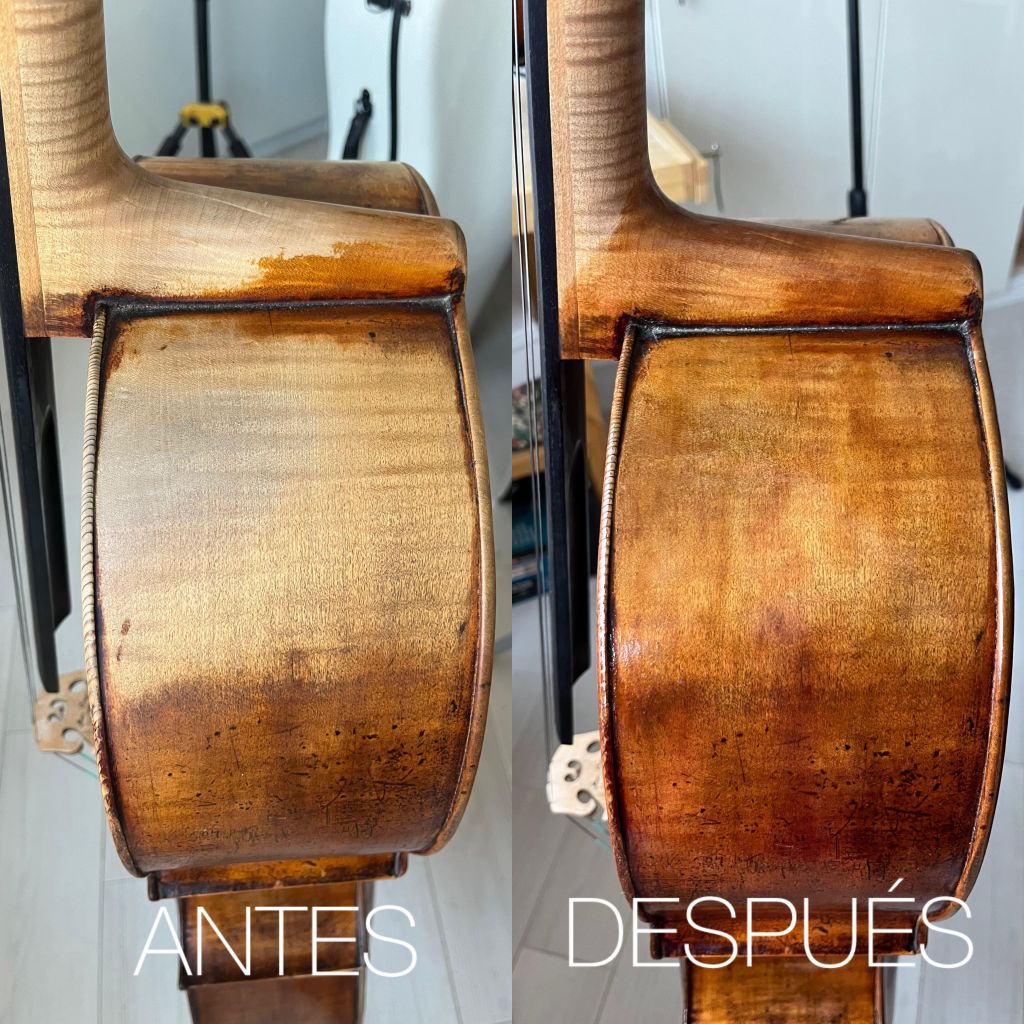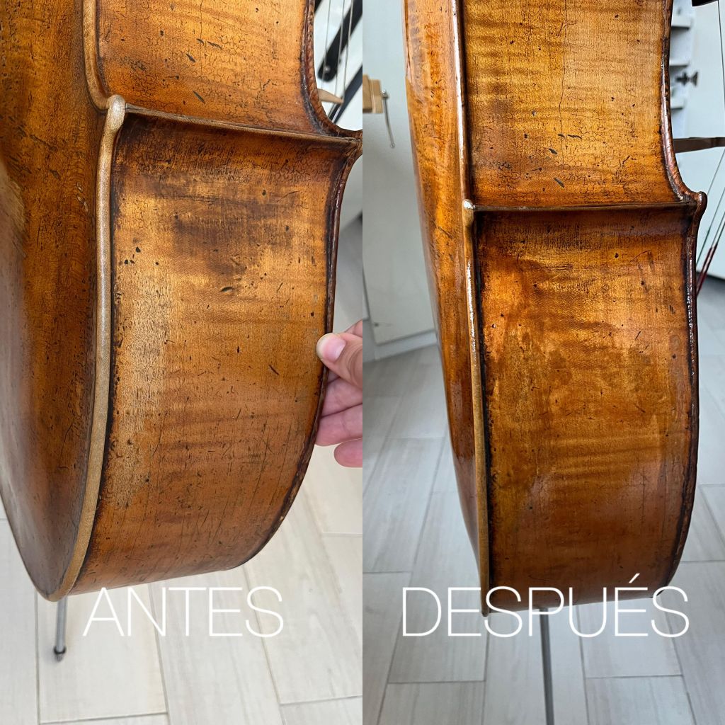 Por expreso deseo de la chelista, se le ha dejado un tono algo más claro en las zonas típicas de contacto del chelo con el músico, a fin de que no perdiera el acabado antiguo tan bonito de este instrumento.